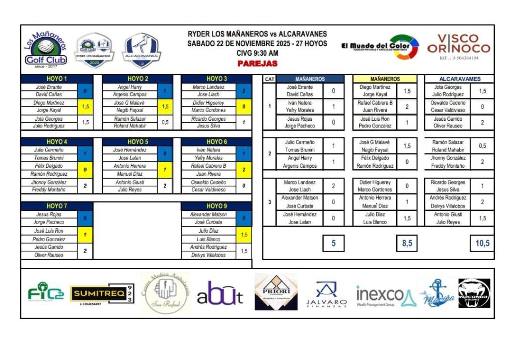 Mientras que segundo se ubicaron los integrantes del equipo Los Mañaneros amarillos que sumaron 22.5 puntos, cerrando filas el cuadro de Los mañaneros azules que totalizaron 17,5, cumpliendo la totalidad de los 27 hoyos en los que constó la competencia.